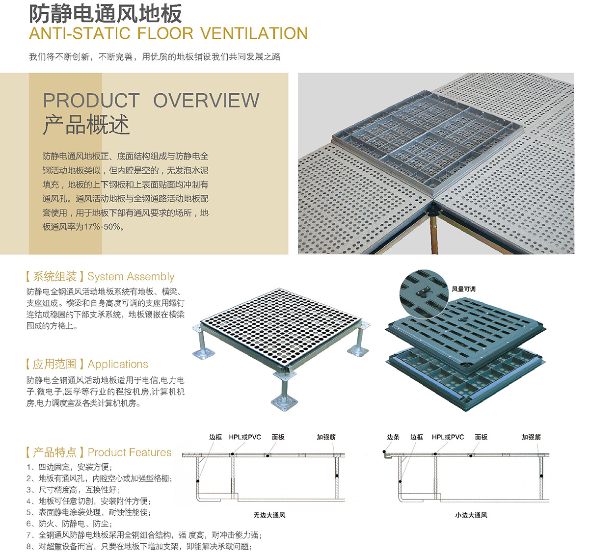 防靜電通風地板正、底面結構組成與防靜電全鋼活動地板類似,但內腔是空的,無發泡水泥填充,地板的上下鋼板和上表面貼面均沖制有通風孔。通風活動地板與全鋼通路活動地板配套使用,用于地板下部有通風要求的場所,地板通風率為17%-50%。